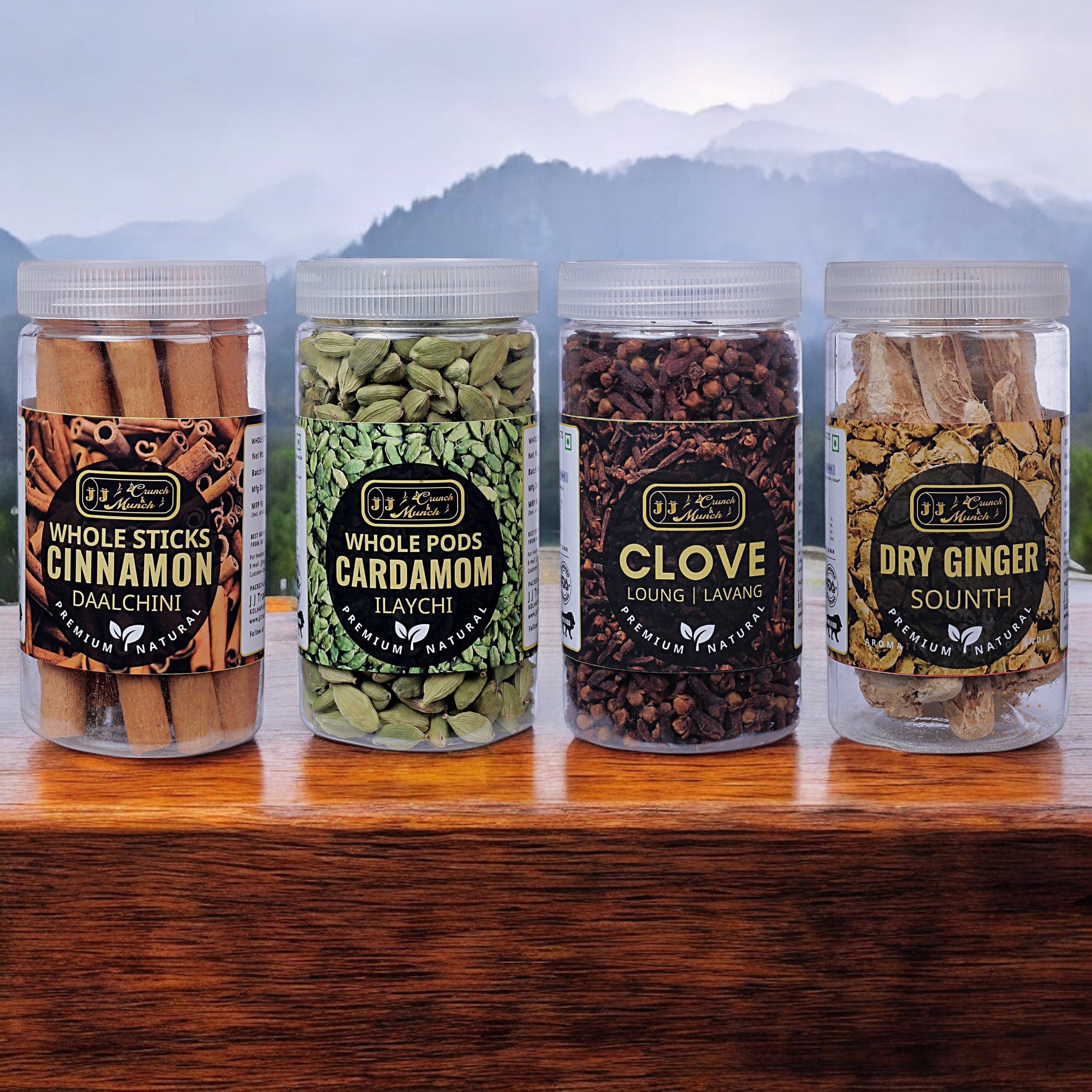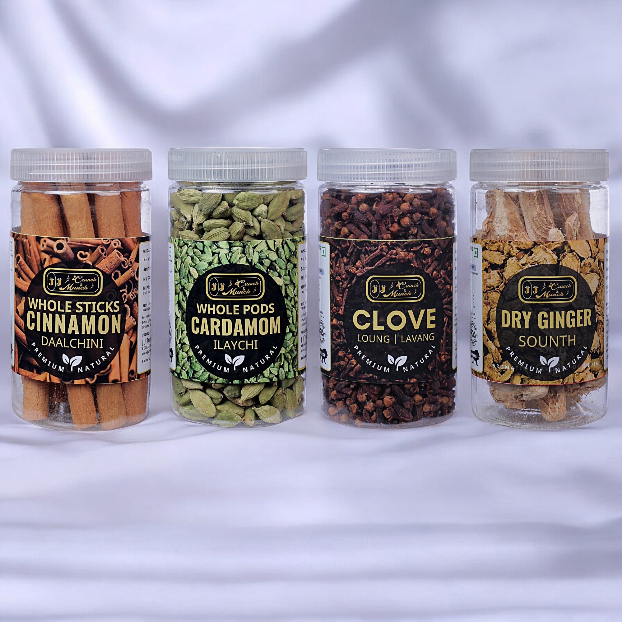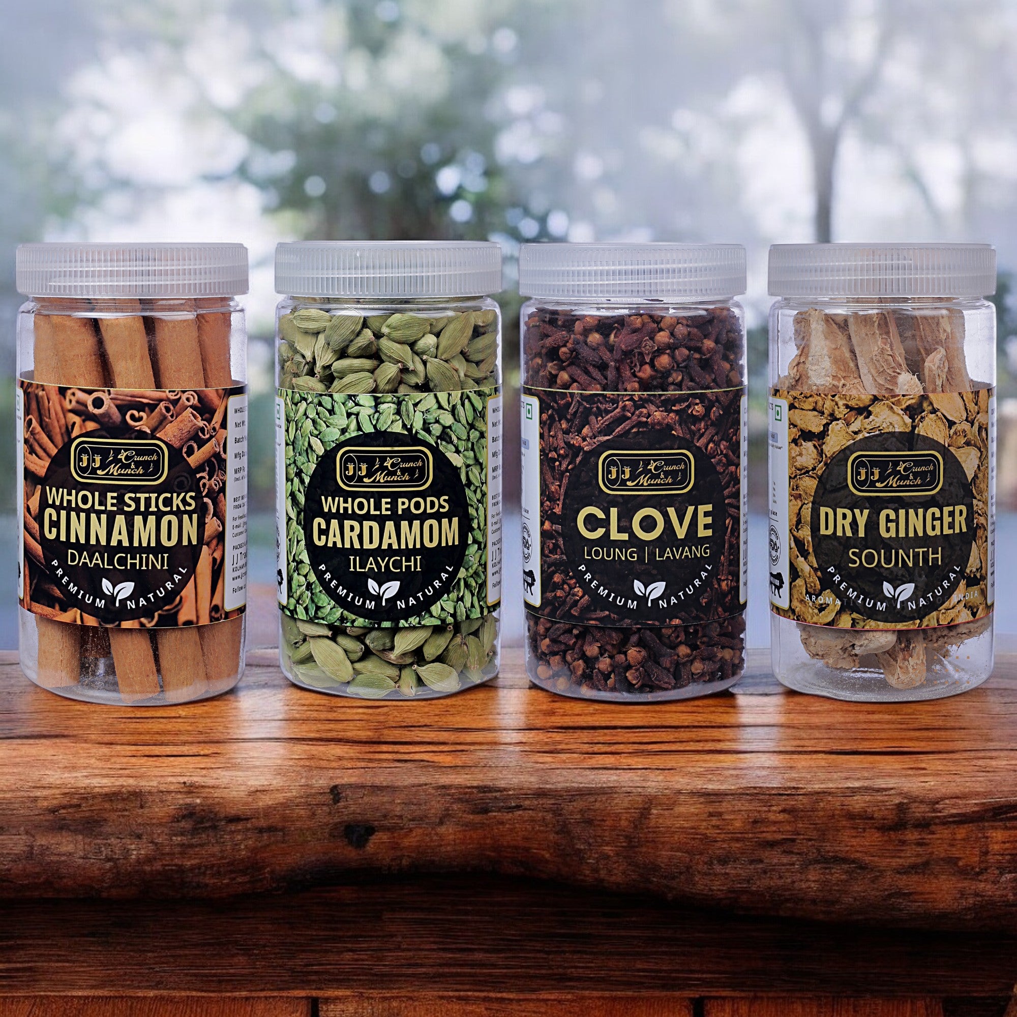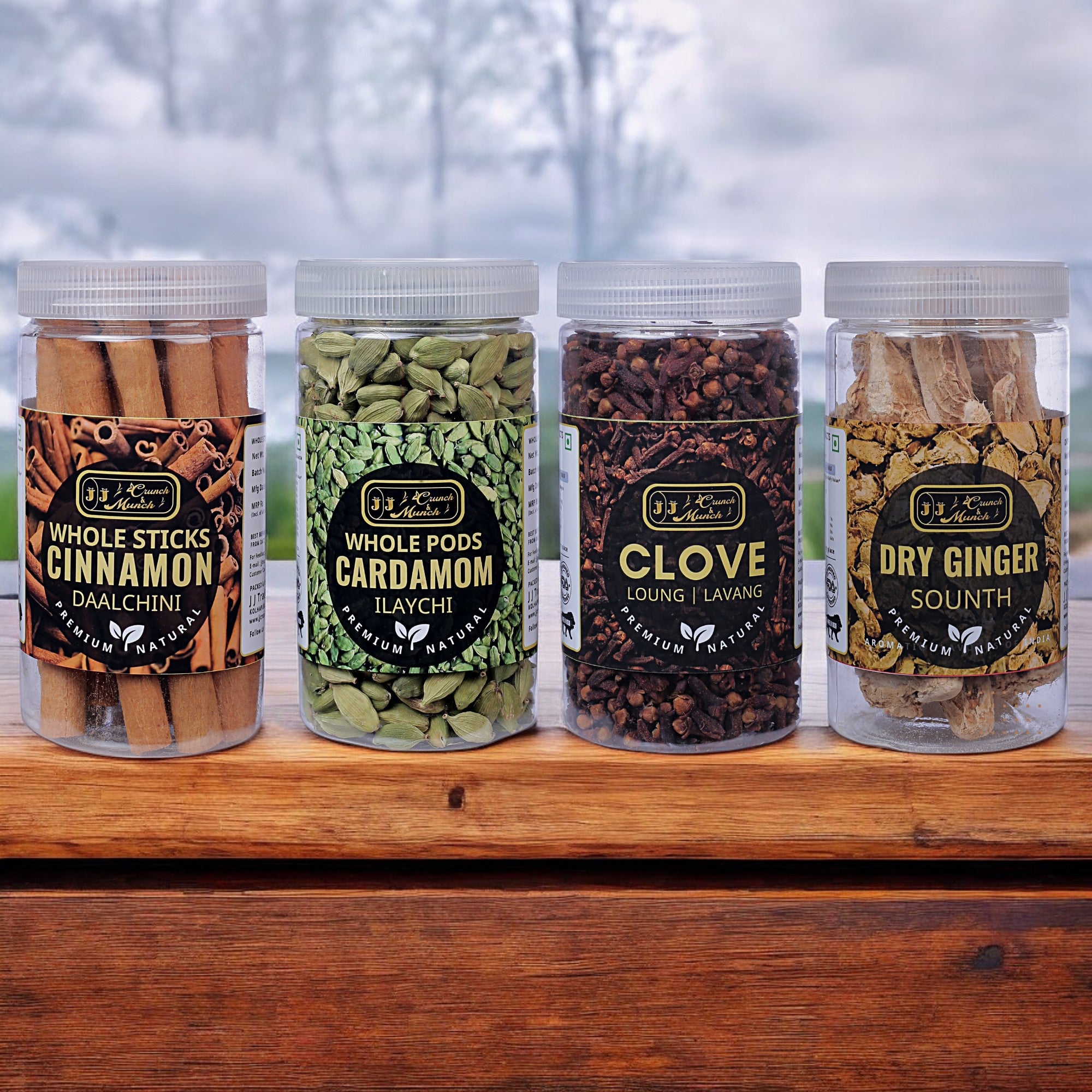Elevate your tea experience with the Aromatic Spice Quartet from J J Crunch N Munch, a carefully curated blend of Cardamom, Cinnamon, Clove, and Dry Ginger—the essential spices for a perfect cup of masala chai. These premium, hand-picked spices are sourced from the finest farms to ensure maximum flavour, freshness, and aroma.